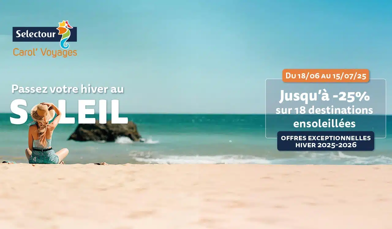 Cet hiver, partez loin du froid avec nos offres jusqu’à -25% sur des destinations soleil : Canaries, Thaïlande, Maurice, Cap Vert, et bien plus encore ! Soleil garanti, prix réduits.